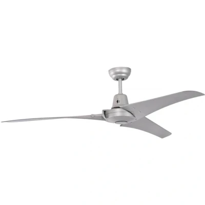General description Vourdries Silver Industrial Ceiling Fan is designed to enhance air circulation in large spaces while adding a modern touch to your decor. With its sleek silver finish and profiled synthetic blades, this fan not only looks great but also operates smoothly and quietly. Technical specifications Diameter: 142 cm / 56" Housing colour: silver Blade colour: silver Power consumption (motor): max. 57 Watt Dimensions from ceiling to blades: 38 cm / 15" (can be shortened to 28 cm / 11") Diameter of canopy: 13 cm / 5" Compatibility and accessories Included wall control (motor off, 3 rotation speeds) Installation Can be mounted to sloping ceilings, max. pitch 38° Usage Forward and reverse function (summer and winter mode) via slide switch on the housing