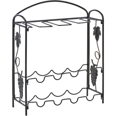 General description This decorative wine rack made of coated iron combines functionality with classic design. Featuring elegant grapevine details on the sides and a subtly glossy finish, it complements both traditional and industrial interiors beautifully. In addition to bottle storage, the upper section includes integrated holders for hanging wine glasses. Perfect for use in a kitchen, dining area, or living room, this compact piece adds both charm and practical value to any space. Technical specifications Product Type: Wine Rack Style: Industrial General Color: Black Material Type: Metal Main Material: Iron Shelves number: 8 Finish: Painted Shelves: Yes Capacity: Up to 12 Bottles Dimensions: Depth: 15 cm, Width: 42 cm, Height: 50 cm Weight: 1.3 kg Installation Partial Assembly Required Estimated Assembly Time: 5-15 min Usage Ideal for storing wine bottles and hanging wine glasses Suitable for kitchens, dining areas, or living rooms Other information Maintenance tips: Clean with a
