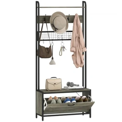 ManoManoGeneral description The HOMCOM Industrial Hall Tree Coat Rack Stand combines functionality and style, featuring a coat rack and a shoe cabinet in a sleek grey finish. This versatile piece is perfect for organizing your entryway or hallway, providing ample space for coats, shoes, and accessories. Other information
