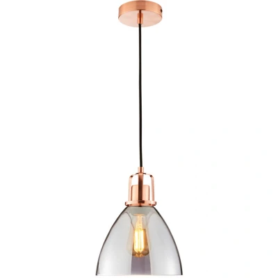 General description Add instant character to any space with the sleek Indy 1 Light Ceiling Pendant featuring a smoke glass shade and warm copper detailing. Ideal for kitchens, dining rooms, or living rooms, this ceiling light adds warmth and sophistication to your room, and will fit perfectly with an adjustable drop height. Technical specifications Product Type: Ceiling Pendant Bulbs Required: 1 (Not Included) Bulb Type: E27 Edison Screw Max Bulb Wattage: 10 Watt Max Bulb Voltage: 240 Volt Light Source: LED Height: 130 cm approx. Diameter: 20 cm approx. Ceiling Cap Diameter: 11 cm approx. Drop: Max: 130 cm, Min: 35 cm approx. Material: Metal, Glass Colour: Copper, Smoke Tint Weight: 0.9 kg