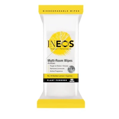 NEXT-GEN : At INEOS, we relentlessly optimise every element of our products through science to deliver next generation performance, making light work of the toughest cleaning jobs in every single room of your home. PLANT-BASED : Made with biodegradable fibres + plant-based cleansers, these wipes not only kill 99.9% of bacteria and viruses*, but wipes out the heaviest grease, grime, limescale and watermarks, meaning it is ideal for both bathrooms AND kitchens. Designed with a unique embossed pattern to capture more dirt than a regular flat wipe, these wipes are a game changer. SICILIAN LEMON + CYPRESS: There's even top-level science behind the choice of fragrance. Zingy, sharp lemon and woody, aromatic cypress have been shown to give vitality and promote a sense of wellbeing. HOW TO USE : Peel back the label and pull wipes through the opening. Reseal the label to retain moisture in the remaining wipes. Wipe surface vigorously, removing all traces of soiling. Leave surface to air dry without wiping or rinsing. INEOS FRAGRANCE TECHNOLOGY : Our products contain fragrance technology comprising of purifying essential oils and phytoncides. Phytoncides are biological particles emitted by plants and trees naturally, which have been shown to inhibit bacteria development and have been credited for their antioxidant and wellbeing priorities and the ability to reduce feelings of stress and fatigue.