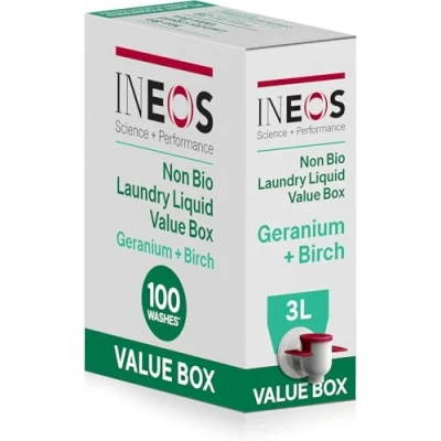 INEOS Next Gen Non Bio Laundry Washing Liquid Detergent, Stain Removal for Clothes, Plant Powered, Eco value box Geranium + Birch 3L, Stress Relieving Fragrance, Vegan, Cruelty Free