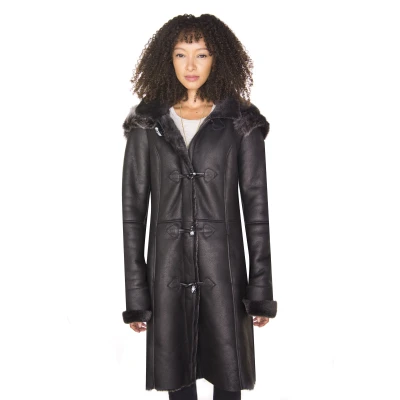 Infinity Leather Ladies Black Snowtip Merino Shearling Sheepskin Hooded Duffle Coat M
