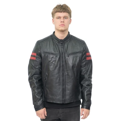 Step into timeless sophistication with our men's Black leather Bomber Jacket, a classic piece designed to elevate your style to new heights. Crafted from premium black leather and adorned with black YKK zips, this jacket exudes both luxury and practicality, making it a staple in your wardrobe. Two zip pockets on the chest and two zip waist pockets offer secure and convenient storage options for your essentials. Stay organized with two internal pockets, keeping your valuables safe and accessible. Stylish stitching detail on the shoulder adds a touch of refinement and elevates the jacket's overall look. The two Red leather contrast panels on the upper sleeves infuse a bold and modern element, making a striking fashion statement. With its versatile design and impeccable attention to detail, this Black leather Bomber Jacket effortlessly complements both casual and semi-formal looks, making it a wardrobe essential for any fashion-forward gentleman