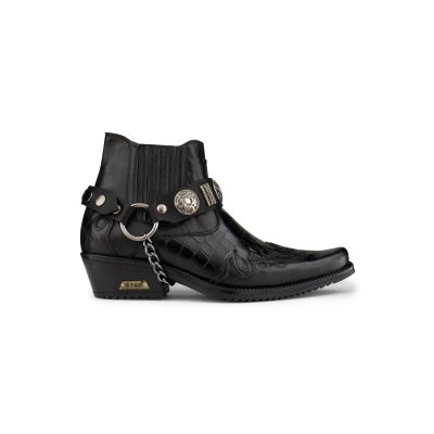 The winklepicker is a popular style of boots, worn since the 1950s and a favourite amongst British Rock and Roll artists throughout time. This pair is complete with the distinctive feature of the winklepicker which is the sharp pointed toe, as well as the traditional ankle boot silhouette and a vintage Cuban heel which stands at 2”. This piece is characterised by the introduction of a stylish crocodile skin texture, as well as stitched panelled designs at the toe and heel and a ruffled design at the sides. This boot is completed by the addition of a tri harness strap feature, which is connected by a metal ring and features metallic badges and studding to create an eye-catching aesthetic.• Crafted from genuine cow hide leather with crocodile skin texture• Features distinctive pointed toe, 2” Cuban heel and ankle high shaft • Tri harness metallic strap feature• ETOR branding embellished in the sole