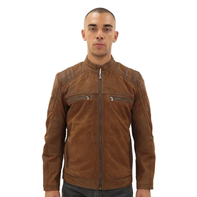 This biker jacket is crafted out of buffed leather and features hand polished metal hardware on the exterior pockets and YKK zip fastening. This is a elegantly finished piece which includes ribbed shoulder panelling and textured detailing on the sleeves. The jacket exterior is furnished with four zip pockets, located across the breast and at the jacket side panels. Coming in tan and brown colourways this is a great jacket for pulling off sophisticated looks and when going out for casual occasions. • Made of genuine buffed leather • Four front zip pockets for secure storage • Short stand collar • Two pockets integrated into the jacket lining • Zipped cuffs
