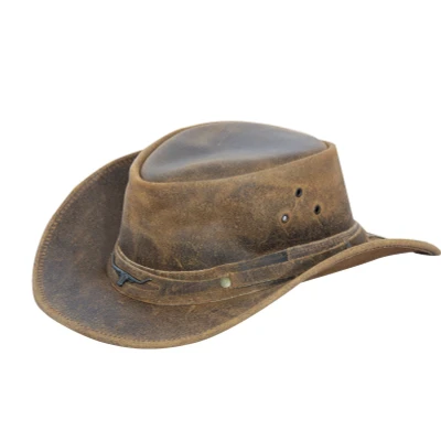 Real leather classic western cowboy outback hat. The crown is trimmed with a braided band. Durable yet cool and lightweight and amazing quality. Premium Quality Craftsmanship, Super Value Priced, Shape Able Brim, Australian western Style, Western Style Bush Leather Hat, Eyelets in crown for ventilation, Comfortable and light weight,