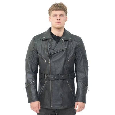 Introducing our tough and durable men's ¾ Leather Biker Jacket, a heritage-inspired design reminiscent of classic motorcycle riders and aviators from the 1930s. Crafted from thick cowhide, this jacket offers both style and protection from the elements, making it a timeless addition to your wardrobe. Longer length and belt cinch around the waist provide added protection and a personalized fit. Double-breasted style with a YKK zip front extending to a wide notched lapel exudes a rugged and vintage appeal. Multiple zipped pockets, including two on the chest, two on the hip, and small key pockets on each forearm, offer ample storage options with a touch of functionality. Zip gauntlet style cuffs add an edgy flair to the jacket's overall design. Optional removable protective CE armour (shoulder, back & elbows) ensures versatility and safety for riders, with velcro pockets for easy placement. Embrace the spirit of adventure with our ¾ Leather Biker Jacket - a true testament to timeless style and craftsmanship. With its impeccable design and reliable YKK zips, this jacket is the perfect companion for motorcycle enthusiasts and anyone seeking an iconic and durable outerwear piece