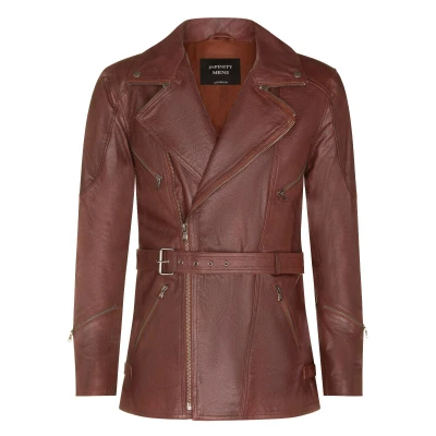 Introducing our tough and durable men's Brown ¾ Leather Biker Jacket, a heritage-inspired design reminiscent of classic motorcycle riders and aviators from the 1930s. Crafted from thick cowhide, this jacket offers both style and protection from the elements, making it a timeless addition to your wardrobe. Longer length and belt cinch around the waist provide added protection and a personalized fit. Double-breasted style with a YKK zip front extending to a wide notched lapel exudes a rugged and vintage appeal. Multiple zipped pockets, including two on the chest, two on the hip, and small key pockets on each forearm, offer ample storage options with a touch of functionality. Zip gauntlet style cuffs add an edgy flair to the jacket's overall design. Optional removable protective CE armour (shoulder, back & elbows) ensures versatility and safety for riders, with velcro pockets for easy placement. Embrace the spirit of adventure with our Brown ¾ Leather Biker Jacket - a true testament to timeless style and craftsmanship. With its impeccable design and reliable YKK zips, this jacket is the perfect companion for motorcycle enthusiasts and anyone seeking an iconic and durable outerwear piece