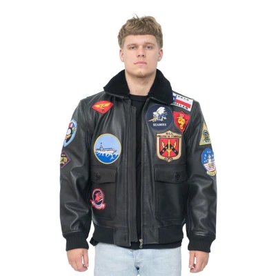 Originally created in 1985, this unique vintage flight jacket was made recognisable by its appearance in the iconic “Top Gun” movie. This jacket features a russet-coloured sheepskin collar, seen in the 60s bomber jacket designs, as well as all 17 patches and the USN Anchor pin, as seen in the film. For authenticity, the leather and patches are given a special vintage treatment, to produce a more worn in patina. For an inspired twist on the classic, we have also featured this style with the badges in more subdued hues to make for a sleeker alternative to the bold original. • High quality genuine cow hide • Iconic in pop culture from its appearance in “Top Gun” • Classic sheep skin shirt style collar • Features 17 patches and USN Anchor Pin on jacket front • Deep pockets on the jacket front as well as internal storage compartments