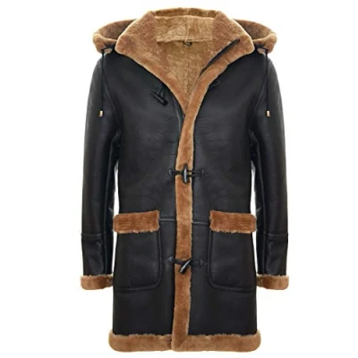 Infinity Leather Mens Winter Sheepskin Hooded Duffle Coat Helsinki Brown Size X Small