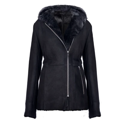 Infinity Leather Women's Elegant Black Snowtip Hooded Suede Merino Shearling Sheepskin Coat S