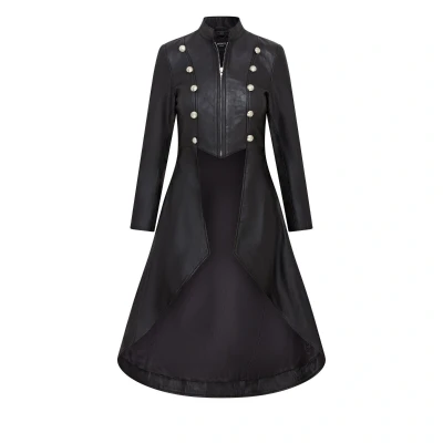 AmazonTailored trench design with gothic flair Premium 100% leather construction Dramatic tail coat hem for a unique silhouette Elegant blend of Edwardian and Victorian styles Perfect for a bold, fashion-forward statement