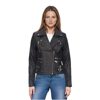 Amazon100% premium ultra-soft Nappa leather Off-centre YKK zip fastening Six zipped exterior pockets for storage Adjustable buckle tabs at the hips Slim-fitting, cropped biker design