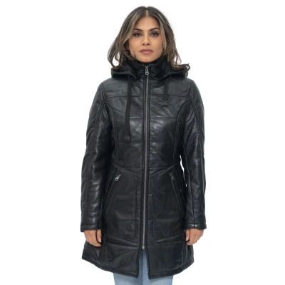 Stay warm and stylish with our Women's Hooded Parka Leather Coat. Crafted from ultra-soft nappa leather, this coat offers a luxurious and comfortable feel. It features two exterior vertical waist pockets for functionality and style. The coat showcases quilted detailing, adding a touch of sophistication to its design. The funnel collar provides extra warmth and a chic look, while the detachable hood offers versatility for changing weather conditions. With YKK zips, the coat ensures durability and ease of use. The insulated quilting provides excellent insulation to keep you cozy during colder days. Step out with confidence in our women's hooded parka leather coat, a perfect blend of fashion and functionality. • Ultra-soft nappa leather construction for a luxurious feel • Two exterior vertical waist pockets for functionality and style • Quilted detailing for added sophistication • Funnel collar for extra warmth and a chic look • Detachable hood for versatility in different weather conditions.