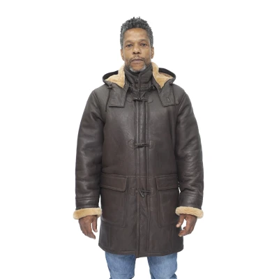 Infinity Men's Brown Sheepskin Leather Detachable Hood Duffle Coat 5XL