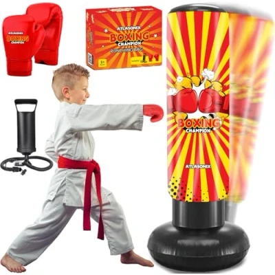 Inflatable Kids Punch Bag, Boxing bag for 5 10 Years Old, Gloves and Pads Set, Free Standing, Kickboxing Standing Dummy Punshing kids, Boys Girls