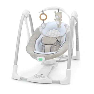 Bring baby’s favorite seat and swing on-the-go with the Ingenuity ConvertMe Swing-2-Seat - Wynn; converts from automatic swing to stationary vibrating seat with EasyLock|Soothe baby with gentle vibrations 5 swing speeds with the WhisperQuiet swing motor to avoid disturbing baby plus preloaded 12 melodies and 4 nature sounds with volume control|Save money on battery costs with the included USB PowerAdapt cord to plug swing in and power motion (wall adaptor not included); Battery required for vibration unit|SlimFold design allows swing to fold flat for storage and portability; assembled dimensions 24.0" x 30.5" x 21.0"; features pivoting toy bar with 2 toys|Soft plush fabrics for baby's comfort; headrest supports small babies and can be removed as child grows; easy-to-clean seat pad and removable headrest