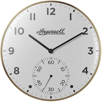 ManoManoDiscover the Ingersoll 30 cm analog wall clock, featuring a modern Scandinavian design. Its gold color and white dial add an elegant touch to your interior. Made of metal, it is durable and ideal for the living room. Batteries not included.