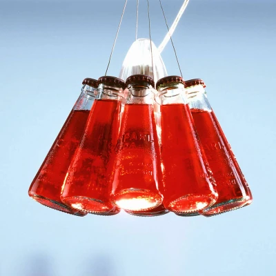 Campari Light - designer pendant light with ten real Campari Soda bottles It is the highlight in every cocktail bar - the Campari Light pendant light from Ingo Maurer! It's not just red-coloured water filled into glass bottles and served as Campari. No, ten original Campari Soda bottles have been bundled together to form the sensational Campari Light pendant light. The bulb, which skilfully uses the red liquid to create a unique lighting effect, is placed in the middle of the bottles, which are arranged in a circle. Of course, attention to detail is not neglected with Campari Light either. The Campari cork, which is attached to the centre of the suspension, is of course a fun eye-catcher, but also allows the light to be continuously adjusted in height. The canopy is deliberately kept transparent so that nothing can distract from the centrepiece of the light. Campari Soda was the world's first convenience Drink on the spirits market. Fortunato Depero, an Italian futurist artist, designed the iconic Campari Soda bottle back in 1932. Exactly 70 years later, Raffaele Celentano rediscovered the artistic potential of the bottle and designed the Campari Light pendant light for Ingo Maurer - not without giving it a witty name, of course, as is typical of Ingo Maurer's lighting creations.