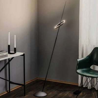 Lamp MastersRingelpiez is a new standing lamp from Ingo Maurer. The standing lamp has an aluminium ring with built-in dimmable light diodes. The angles of the rings, stand, and LED lights can be adjusted as needed. The stand can be adjusted vertically or at an angle of 15°. The cable is inside the stand. The lamp is 150 cm tall, but can be extended up to 210 cm. The right with the light diodes is available in black or white. The Ringelpiez standing lamp is a fully functional and flexible lamp, well-suited for various purposes.
