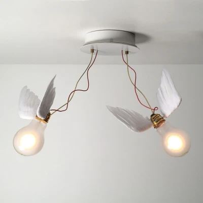 Winged light - LED ceiling lamp with impressive design With the Lucellino series, designer Ingo Maurer has succeeded in creating impressive lights with a winging effect. Lucellino Doppio features LED lamps fitted with goose feathers. Held by thin wires on the round canopy, they give the impression of immediately wanting to fly away like two little birds. The naming is a great play on words from the Italian words "luce" for "light" and "ucellino" for "little bird". It's an excellent composition, as the lamp actually looks like illuminated little birds. The LED lamps are specially made for the designer. The lamp is supplied with matching, high-quality bulbs. Lucellino Doppio LED lamp can be mounted either as a wall or ceiling lamp and is not suitable for rooms with high humidity.