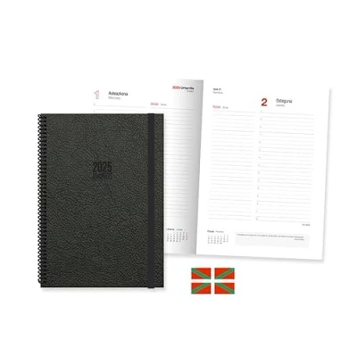 HIGH QUALITY PAPER - Uses 80g opaque satin paper that prevents ink bleed-through, allowing you to write with fountain pens without worry. Binding and Cover: Flexible plastic spiral binding makes opening and easy to use every day, along with a hard-cover made of heat-insulating leatherette that offers an elegant and durable touch. Multilingualism and Culturality: Available in multiple languages, including Catalan, Basque and Spanish, each diary incorporates famous phrases and relevant proverbs, enriching the user experience, always includes English. Functional layouts: It offers two configurations: day per page with six pages per week for detailed planning and week to view with dedicated note slots, adapting to different organizational needs. Practical details: Includes an elastic band to keep the diary closed and secure, as well as a design that incorporates both English and Spanish in all versions, ensuring its usefulness in international contexts.