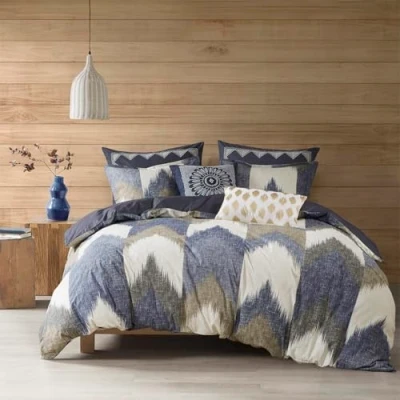 FEATURES Sophisticated heather printed broken chevron pattern in navy, dusty blue, charcoal and taupe colors on ivory ground; reverses to solid dusty navy Set includes one duvet cover (insert not included), 2 shams MEASUREMENT Duvet dimension 88-by-92 inches, 2 shams dimension 20-by-26 inches FABRICATION Face fabric 100% cotton Machine washable and imported