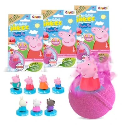 FUN SURPRISE BATH TIME : Drop in the Peppa Pig bath bomb and watch it fizz with an exciting toy surprise inside - The water transforms into a beautiful pink or blue bubbly bath, making every soak feel like a fun reveal STRAWBERRY SCENT & COLOUR CHANGE : Enjoy a sweet strawberry ice cream scent as it fizzes away. The children bubble bath turns pink or blue with playful bubbles, turning ordinary bath time into a colourful, feel-good experience for little Peppa Pig toys fans COLLECTIBLE STAMP FIGURES : Each bath bomb hides a Peppa Pig stamp figure inside. There are 7 different designs to collect, adding an extra unboxing moment that keeps kids excited to discover which character they get next GENTLE & CLEAN BATHING : Designed as a kids baby bubble bath for family routines, it suits bubble bath sensitive skin needs while being kind in the tub, helping the bath stuff for kids stay easy to rinse away GIFTABLE BOX OF 3 : Packed in a cute box bundle of three, perfect for kids bath treats, party rewards and birthday surprises—an easy pick for gifts for 4 year old girl who loves Peppa Pig