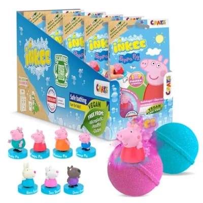 FUN SURPRISE BATH TIME : Drop in the Peppa Pig bath bomb and watch it fizz with an exciting toy surprise inside - The water transforms into a beautiful pink or blue bubbly bath, making every soak feel like a fun reveal STRAWBERRY SCENT & COLOUR CHANGE : Enjoy a sweet strawberry ice cream scent as it fizzes away. The children bubble bath turns pink or blue with playful bubbles, turning ordinary bath time into a colourful, feel-good experience for little Peppa Pig toys fans COLLECTIBLE STAMP FIGURES : Each bath bomb hides a Peppa Pig stamp figure inside. There are 7 different designs to collect, adding an extra unboxing moment that keeps kids excited to discover which character they get next GENTLE & CLEAN BATHING : Designed as a kids baby bubble bath for family routines, it suits bubble bath sensitive skin needs while being kind in the tub, helping the bath stuff for kids stay easy to rinse away GIFTABLE BOX OF 5 : Packed in a cute box bundle of three, perfect for kids bath treats, party rewards and birthday surprises—an easy pick for gifts for 4 year old girl who loves Peppa Pig
