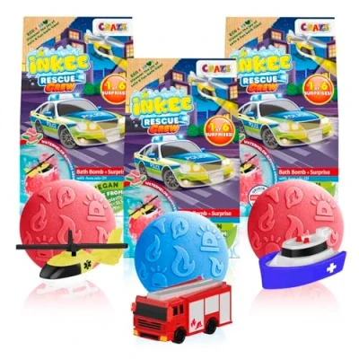 Exciting Surprise Bath Bomb with Toy Inside : Each INKEE bath bomb with surprise inside reveals one of six collectible Monster Trucks, turning bath time into an exciting rescue adventure that children can’t wait to discover - 3 bath bombs included in the delivery Colourful and Fragrant Bath Time Fun : These fun bath toys fizz and bubble in bright red or blue water while releasing a delightful watermelon gummy scent, transforming the bath into a joyful, sensory experience Gentle on Sensitive Skin : Specifically formulated as kids bath bombs sensitive skin, INKEE bath bombs are dermatologically tested by TÜV Rheinland, rated “Excellent” by Dermatest, and free from microplastics or harsh ingredients Perfect Bath Treat or Small Gift : A thoughtful choice for christmas gifts stocking fillers kids will adore — the surprise bath bombs make bath time entertaining for little ones who may not usually enjoy bathing Safe and Non-Staining Formula : These bath bombs for children dissolve completely without staining the skin, hair or bathtub, ensuring clean, safe fun every time you use this kids bath bomb set