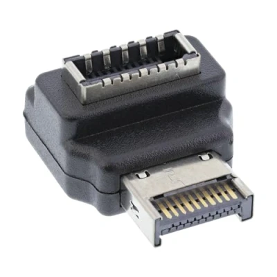 Angle adapter 90° for connecting internal USB 3.2 (Gen.2) devices with USB-E front panel connector to the USB-E port of the computer motherboard, data transfer max. 10Gb/s Front panel USB 3.2 Type-E Key-A female male to female, 90° angled Dimensions: 24 x 19 x 12 mm