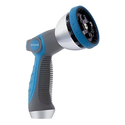 THUMB CONTROL DESIGN: This nozzle was designed to operate effortlessly simply by pushing the switch up with your thumb to turn it on and control the water flow. Stop overtaxing those fingers by squeezing trigger handles, this nozzle will have zero strain on your fingers and will prevent Arthritis pain. ERGONOMIC PISTOL GRIP: The soft rubberized no-slip grip makes this sprayer comfortable to hold for long periods of time. Don't get your hand burnt when grabbing one of those bare metal nozzles that were left in the sun on a hot summer day neither should your hands freeze in pain when holding them on a cold winter day. This molded rubber nozzle with its ergonomic design has an insulated grip and is comfortable in hand. 10 WATERING PATTERNS: Whether you need a high-pressure jet to clean a hard surface or a soft delicate shower to water the garden, this nozzle has you covered. It has spray pattern options for every watering need, including fan, mist, soaker, jet, and you can change the pattern easily with a twist of the head disk. LEAK-FREE CONNECTION: A precision threaded connection and rubber gasket makes for a perfect attachment to your hose and provides a water-tight seal, making this nozzle completely leak-free. No need anymore to have water dripping on your hand while spraying! The diameter of the nozzle connection is suitable for all standard garden hoses with 3/4” diameter thread. 100% SATISFACTION GUARANTEE: The INNAV8 hose nozzle comes with a 12 month warranty, Weight: 0.56 pounds, Manufacturer: INNAV8 - Inspired by Gilmour melnor dramm orbit bonaire dradco