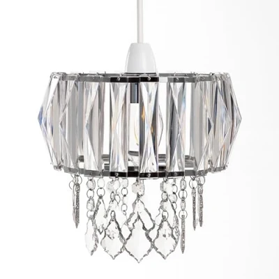 SLEEK PRISMATIC DESIGN: Features a polished chrome frame with sparkling prismatic acrylic crystal strips and clear faceted droplets that create shimmering light reflections in any room. ELEGANT INTERIOR UPGRADE: Adds a modern, luxurious touch to bedrooms, living rooms, hallways, restaurants, and dining areas with its sparkling decorative presence. UNIVERSAL LAMP HOLDER COMPATIBILITY: Suitable for E27 to B22 bulb holders; works with GLS max 60W or energy-saving bulbs up to 21W. Size adaptor included for E27 to B22 holders. EASY FIT & NO ELECTRICAL WORK: Designed as a non-electrical clip-on shade that fits directly over your existing pendant; quick and tool-free installation. LOW MAINTENANCE & DURABLE: Made with high-quality acrylic crystals and a sturdy chrome frame that maintains shine while offering long-lasting performance.