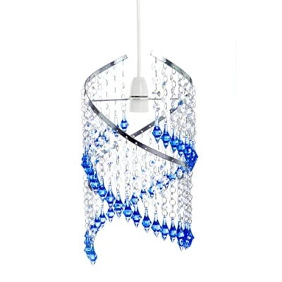 SPIRAL CRYSTAL DROPLET DESIGN: Features a polished chrome frame with clear faceted acrylic beads and sparkling blue droplets arranged in an elegant spiral for a modern decorative lighting effect. LUXURIOUS INTERIOR UPLIFT: Adds a premium, stylish touch to bedrooms, living rooms, hallways, dining rooms and cafés, enhancing ambience with shimmering reflections and vibrant blue accents. UNIVERSAL BULB HOLDER COMPATIBILITY: Works with E27, B22 fittings; suitable for GLS max 60W or energy-saving bulbs up to 21W. Adaptor included for E27 and B22 holders. Bulb not included. EASY-FIT NON-ELECTRICAL INSTALLATION: Installs directly over existing pendant fittings with no wiring or tools required, allowing quick and effortless home lighting upgrades. DURABLE ACRYLIC BUILD: Made from high-quality acrylic crystals with a chrome frame that maintains shine, resists wear and delivers long-lasting decorative performance.