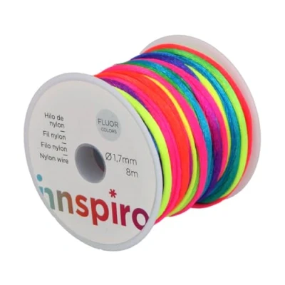 Satin nylon thread of 8 meters and diameter. 1.7 mm and fluorine colour and formed by a smooth continuous transition of colours, from yellow to green, pink, blue and lilac IDEAL: From crafting delicate necklaces and bracelets, to the intricate macrame technique, its strength and flexibility make it the perfect choice. For use with the Kumihimo tool CONTENTS: Roll of 8 m Nylon Thread diameter, 1.7 mm.