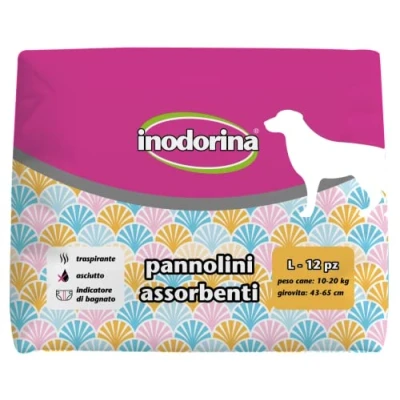 Inodorina, Disposable Absorbent Diapers, Breathable Technology and Wet Indicator, with Tail Hole Long Fins, for Dogs Weight from 10 20 kg, Size L, Pack of 12