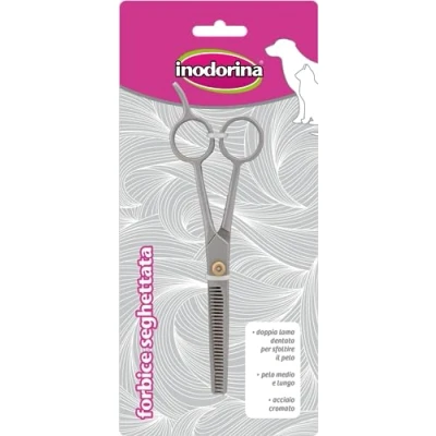 SCISSORS WITH DOUBLE SAWED BLADE: Inodorina's serrated scissors are ideal for trimming and thinning the coats of dogs and cats with medium or long hair, providing a precise, clean cut FOR SAFELY RETAINING AND FINISHING: Perfect for safely and quickly thinning and trimming the coat, even in the most difficult areas, such as paws, ears and bangs MADE OF CHROMIZED STEEL: The scissors are made of high quality, strong and durable chrome-plated steel for extended use without compromising cutting precision SIGNED INODORINA QUALITY: From daily hygiene to coat care, Inodorina accompanies you with safe, fragrant and practical products. Also try shampoos, wipes, deodorants and more to care for your four-legged friends IDEAL FOR MEDIUM AND LONG HAIRED PETS: The double serrated blade makes it easy to thin hair evenly and safely, without damaging your pet's coat or sensitive skin, Weight: 0.220462262 pounds, Manufacturer: Pet Village Srl