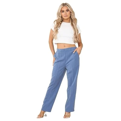 INSAFIANS Women Half Elasticated Pull Up Pants Ladies Office Wear Trousers Work Formal (UK, Numeric, 12, Regular, Long, D Blue)