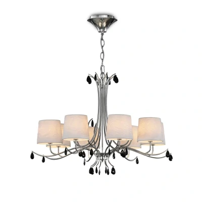 Inspired Mantra Andrea Ceiling Pendant 100cm Round, 8 x E14 (Max 20W), Polished Chrome, White Shades, Black Crystal Droplets