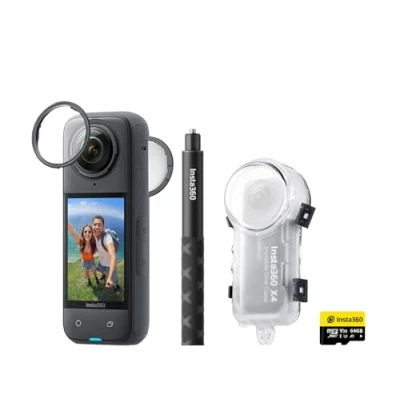 IMMERSIVE 360 VIDEO - The 8K era is here. Insta360 X4 delivers 360° video in stunning 8K or 5.7K60fps! Use Active HDR to keep shots color accurate too, even in action scenarios. SIMPLE, EASY REFRAMING - With Insta360 X4, get out there and shoot, not having to worry about lining up a shot. Shoot first, then reframe easily after, all in the AI-powered Insta360 app. INVISIBLE SELFIE STICK - The signature third-person Insta360 shot, a specialty of 360 cameras. Immerse your viewers in obstruction-free 360° video, just like you're using a drone or as if you have your own film crew. 4K & 170° ULTRA-WIDE POV - X4 can also be used as a wide-angle 4K action camera at a whopping 4K60fps, or get super wide views with the incredible 170° MaxView at 4K30fps. Kit Includes: Insta360 X4, Insta360 MicroSD Card 64GB, Insta360 Invisible Selfie Stick ONE X2, X3 RS 114cm, Insta360 X4 40M Dive case,