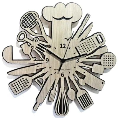 🍴 Chef-Inspired Design: Features whisk, grater, spatula, ladle, and more—perfect for passionate cooks and food lovers. 🪵 Natural Wood Look: Elegant light wood finish adds a rustic yet modern feel to your kitchen decor. 🔇 Silent No-Ticking: Quartz mechanism ensures peace and quiet while you cook or entertain. 🛠️ Ready to Hang: Lightweight, easy to mount, and powered by one AA battery (not included). 📏 Dimensions: 12 inches | 30 cm diameter.