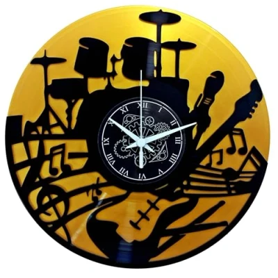 ARTISTIC DESIGN: Wall clock made from 2 authentic vinyl records, depicting a musical composition with drums, guitar and music notes in black silhouette. The design is produced on a black vinyl record, while the second gold vinyl record acts as a contrast IDEAL SIZE: Diameter of 30 cm, perfect for decorating walls of music studios, rehearsal rooms or home environments MUSICAL STYLE: Thematic decoration with intricate musical elements, Roman numerals and mechanical gears on the dial VERSATILITY: Great as a gift for musicians, music teachers or musical instrument enthusiasts DURABLE MATERIAL: Constructed of durable vinyl with silent quartz mechanism for precise time keeping