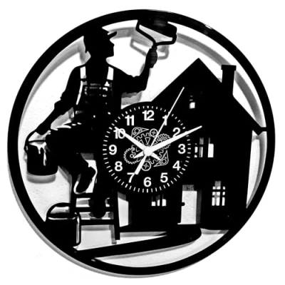 ELEGANT DESIGN: Black vinyl wall clock with decorative silhouette of a painter at work, perfect for decorating any room in style PRECISE SIZE: Measures 30cm in diameter and 4.2cm deep, ideal for optimal visibility in any room VERSATILITY: Suitable for different environments such as living room, kitchen, study, garage or classroom, with clear and readable analog display FUNCTIONALITY: Silent mechanism ensures discreet operation, powered by 1 AA battery (not included) INSTALLATION: Easy wall mounting with a hook included, weight of 350 g for optimal stability