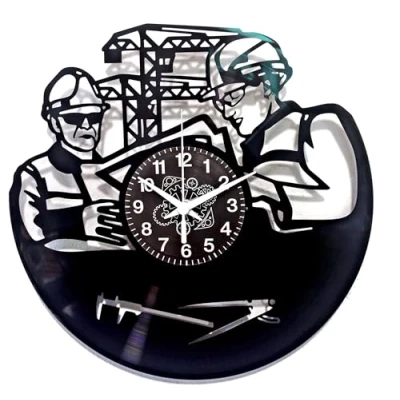 UNIQUE DESIGN - Wall clock made of vinyl record with Surveyor pattern, depicting measuring instruments and a construction crane IDEAL SIZE: Diameter of 30 cm, perfect for decorating walls in technical offices, design studios or industrial environments INDUSTRIAL STYLE: Silhouette in black on vinyl background with clear dial and decorative gears in the centre TECHNICAL DETAILS: Silent quartz movement with clearly visible white hands and clear Arabic numerals on the dial DECORATIVE ELEMENT: Perfect fusion of functionality and industrial design, ideal for construction professionals and engineering enthusiasts