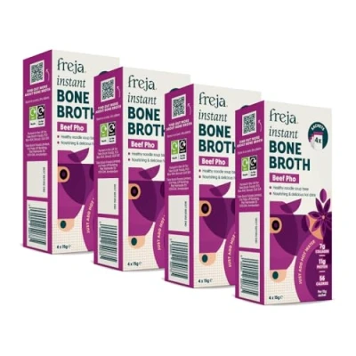 ✔ AUTHENTIC ASIAN FLAVOUR, READY IN SECONDS – Crafted with slow-simmered bone broth, aromatic herbs, and warming spices, Freja Instant Bone Broth delivers deep, restaurant-quality flavour in an instant. Just add hot water, stir, and enjoy. ✔ CLEAN, FUNCTIONAL NUTRITION – Naturally rich in collagen (up to 7g per serving), protein (up to 11g per serving), and essential amino acids to support gut health, immunity, and overall wellness. ✔ A BETTER INSTANT NOODLE BROTH – No artificial flavourings, or ultra-processed ingredients. Just real bone broth, herbs, and spices for a clean-label alternative that’s packed with real nutrition and umami depth, just add noodles! ✔ VERSATILE & EASY TO USE – Perfect for ramen, pho, soups, sauces, and sipping. A quick, nutritious way to elevate any dish or enjoy a comforting, high-protein broth on its own. ✔ CONVENIENCE WITHOUT COMPROMISE – Four easy-to-use sachets with a 24-month shelf life. Simmered for hours, ready in seconds!