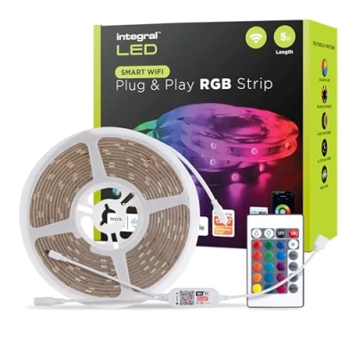 Integral 5m RGB LED Strip Light, Colour Changing, Dimmable, Music Sync Tuya WiFi Smart App & Remote Control, Plug Play with UK for Bedroom, Living Room, Office, Kitchen and More