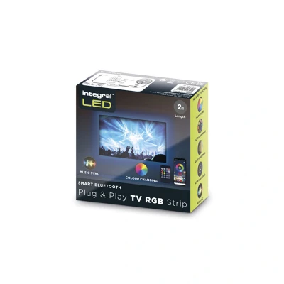 Home Decor: Enhance your living room/kitchen/dining room/bedroom/gaming room decor with an Integral RGB LED TV and Screen Strip Backlight Kit (2m x 10mm). With 24 LEDs/metre and 120° beam angle, the LED strip light provides ambient lighting while you watch TV or play video games. The kit includes an IR remote controller and USB connector. Set the Mood: Get the lighting just right with the wide variety of colour options and settings available on these dimmable RGB LED strip lights. Adjust the brightness, flash speed, and colour, plus choose from multiple running modes Bluetooth Control: Effortlessly adjust the LED Strip Light settings with the remote control or create advanced schedules, enable music sync with adjustable sensitivity, and have access to extra running modes with the Ehome app on your smart device via Bluetooth connection. Energy Efficient: These LED lights run at 5V DC Constant Voltage with a power consumption per metre of 1.5 W/m. These efficient strips provide a lifetime of 20,000 hours. Easy Installation: The LED light strip is conveniently USB powered straight from your TV and comes with a USB connector. With optional cut points and attached 3M tape, you can fit this flexible LED RGB strip easily and precisely to the back of the TV or screen.