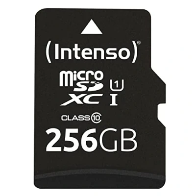 Speed class: Class 10, U1 (Guaranteed minimum transfer rate: 10 MB/s) memory storage capacity: 256.0 Particularly recommended for high-quality mobile phones, smartphones and tablet PCs Box contents: Intenso Premium microSDXC 256 GB UHS-I Class 10 memory card with SD adapter Scope of delivery: Intenso Premium microsSDXC Memory Card 256 GB, incl. SD Adapter, Class 10, UHS-I, Black Scope of delivery: intense premium micro SDXC memory card incl. Sd adapter Ideal for Android-based and Windows smartphones and tablets, cameras, driving recorders, drones and security system