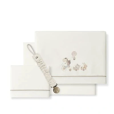 Standard Baby Cot Bed Sheet Set, consisting of 3 pieces Fitted Sheet, Countertop and Pillowcase. Made of 100% cotton, perfect for the spring and summer months being very breathable. Dimensions fitted sheet: 60x120 cm, flat sheet: 106x145 cm and pillowcase: 60x40 cm. Includes a muslin pacifier as a gift. Made in Spain.